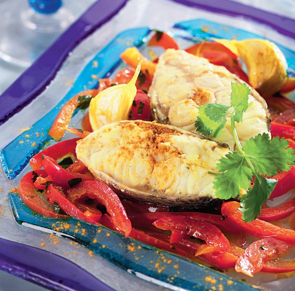 3. Apoi, într-un vas de cuptor, se pun ardeii si caţeii de usturoi în camasa, se asaza bucaţile de peste si se da vasul la cuptor pentru 15 minute.