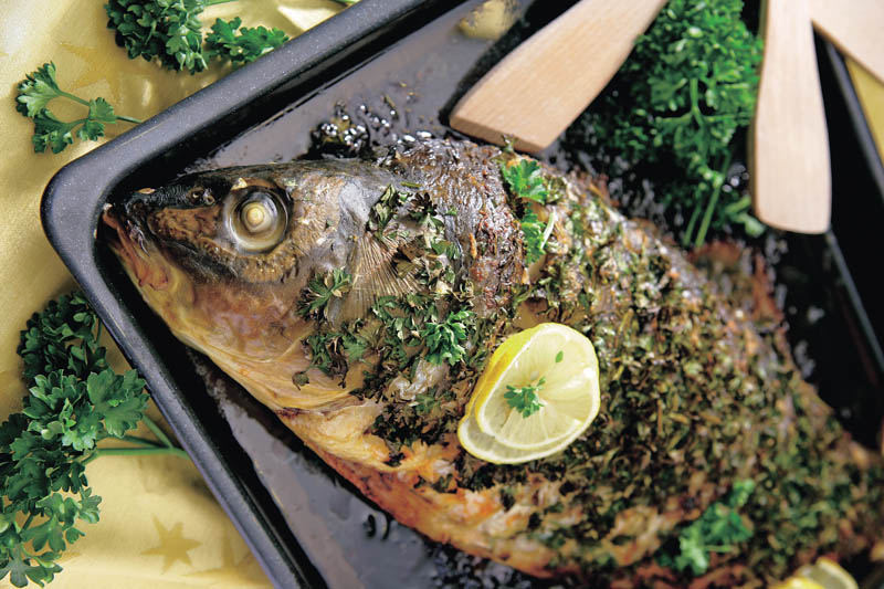 1. Peştele se curăţă, se spală şi se lasă la scurs într-o strecurătoare. Se stropeşte apoi cu zeamă de lămâie şi se presară cu sare şi piper, pe toate părţile şi la interior. Se pune într-un castron, se acoperă şi se lasă la rece 15-20 minute.