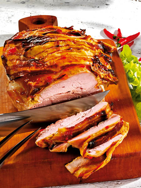 4. Cealaltă parte de condimente se presară peste bacon, se toarnă în tavă vinul amestecat cu uleiul de floarea soarelui şi se bagă la cuptor. Se lasă să se coacă la foc potrivit şi, după ce s-a rumenit, se taie felii subţiri. Se poate servi atât cald, cât şi rece.