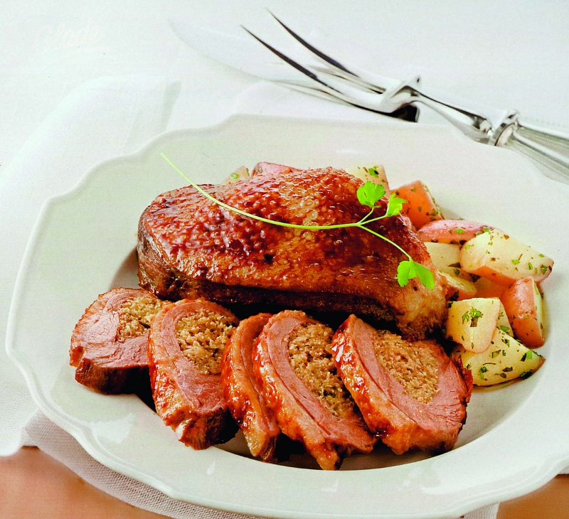 3. Se umplu bucăţile de piept cu această compoziţie, apoi se prind cu scobitori sau se cos. Se aşază într-o tavă unsă cu ulei şi jumătate de pahar cu apă. Se coace în cuptorul încins, la foc tare, 35-45 de minute. După 15 minute focul se reduce, iar bucăţile de carne se întorc şi se stropesc cu coniac.