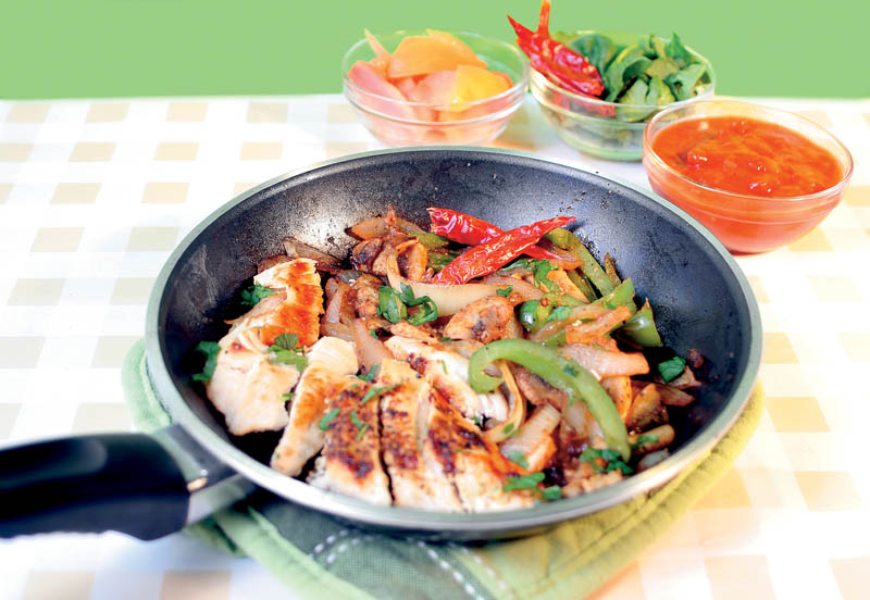 1. Se spală pieptul de pui, se curăţă de pieliţe şi se lasă să se zvânte. Se taie în felii subţiri ca pentru şniţel şi se prăjesc în tigaia încinsă cu ulei până capătă culoarea arămie.