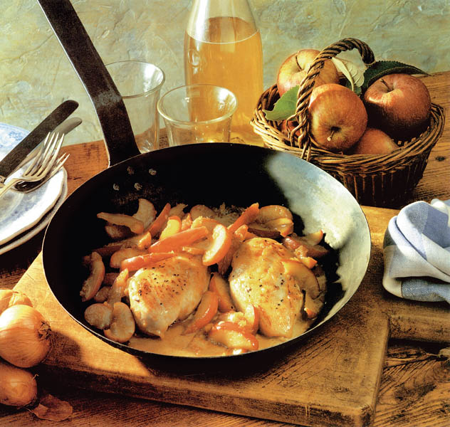 1. Pieptul de pui se spală şi se usucă. Se prăjeşte în ulei şi se condimentează cu sare. Se scot bucăţile de pui din tigaie şi se pun într-un vas acoperit. Merele se spală, se curăţă de seminţe şi se taie felii. Se călesc într-o tigaie încinsă cu unt, amestecând uşor, fără să se strivească. Se adaugă pieptul de pui, vinul îndoit cu apă şi se lasă să fiarbă înăbuşit, la foc potrivit, 5 – 10 minute.