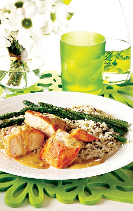 4. Pe fiecare farfurie, se pun câteva bucățele de carne de pui cu sos de muștar, garnitură de orez și câteva fire de sparanghel.