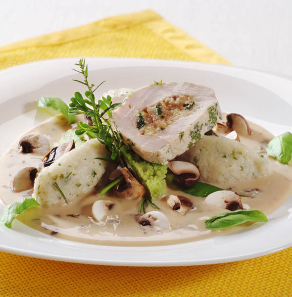 4. Se umple pieptul cu o parte din ciupercile călite, se presară pătrunjel tocat mărunt, se rulează şi se bagă în cuptor. Se serveşte cu sosul alb și cu ciupercile călite. Se ornează cu rozmarin.