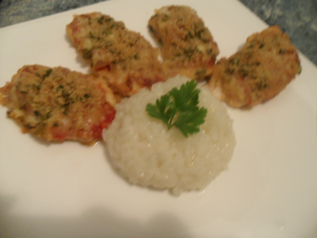 Am scos tava după cele 35 minute şi am pus pe fiecare bucată de piept caşcaval ras şi apoi cam 2 linguri pesmet (pe bucată).