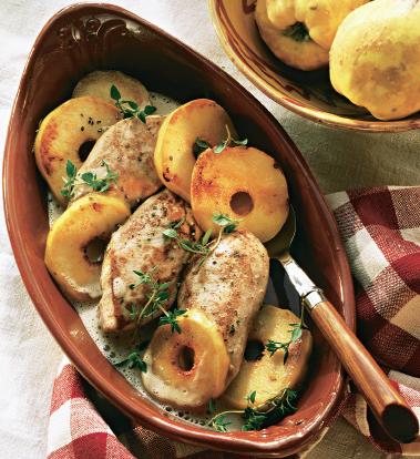 3. Se curăţă gutuile, se spală şi se taie rondele. Se scoate pieptul de pui, se aşază într-o tavă termorezistentă tapetată cu unt şi cu pesmet, se aranjează rondelele de gutui şi se bagă în cuptorul încins în prealabil.