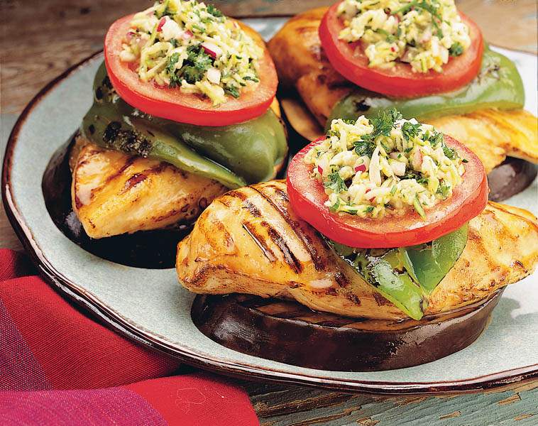 4. Pieptul de pui, vinetele şi gogoşarul se frig pe grătarul foarte bine încins, câte 10 minute pe fiecare parte. Când se servesc, se adaugă câte o felie de roşie cu cremă de brânză.