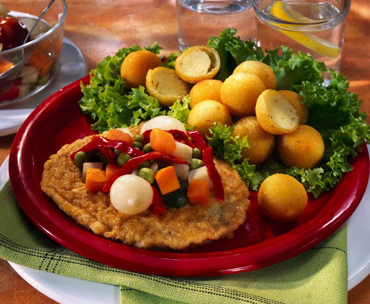 4. Separat, se bat ouăle pentru şniţel, cu sare, piper şi muştar. Pieptul de pui se trece prin făină cu pesmet şi parmezan, ou şi pesmet şi se prăjesc în uleiul încins. Se servesc pe frunze de salată, cu bulete de caşcaval şi cu amestec de legume la alegere.