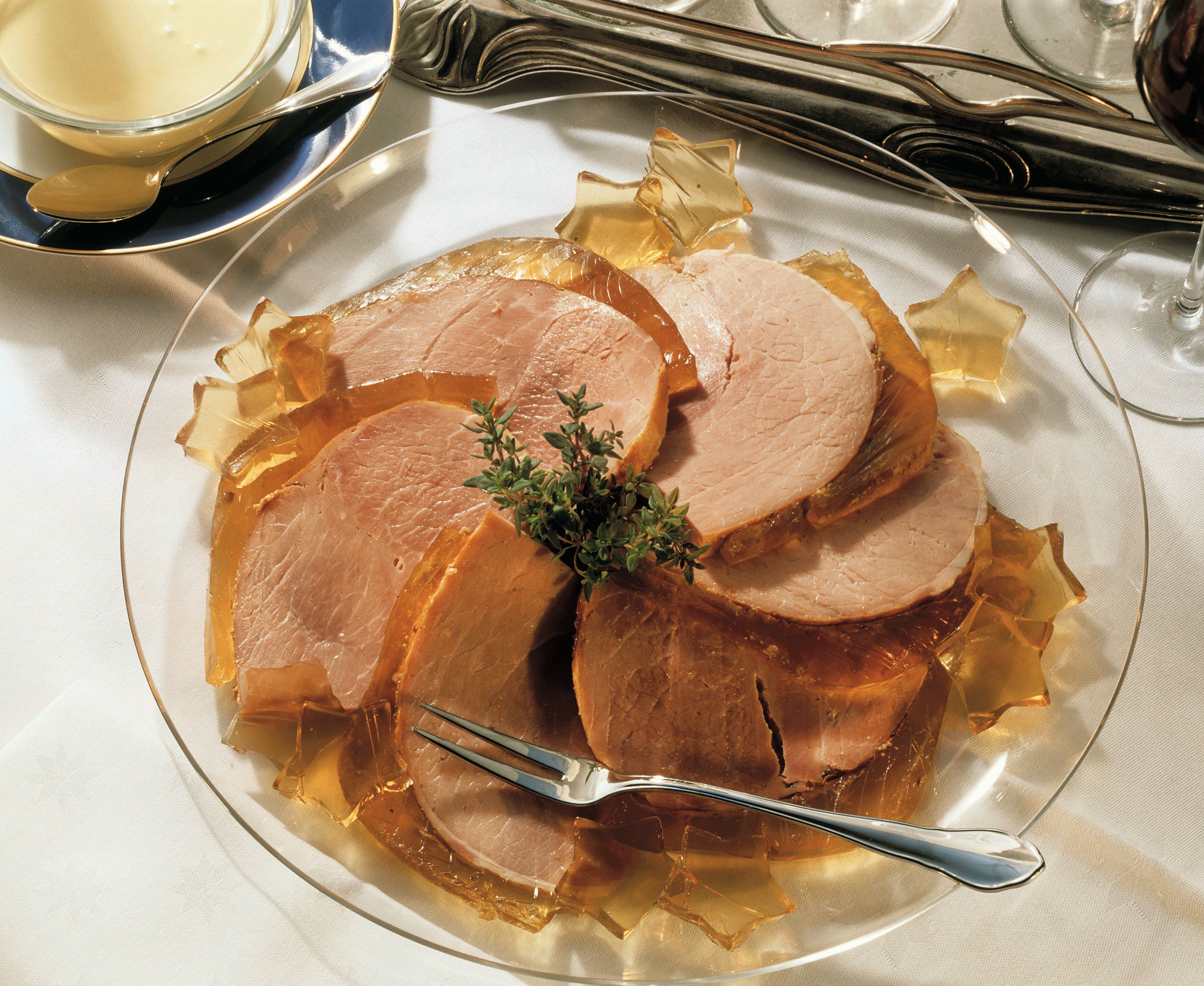4. Înainte de a se aduce la masă, se înmoaie câteva secunde forma în apă caldă, se răstoarnă pe un platou, se decorează cu crenguţe de cimbru şi cu forme decupate din aspicul subţire.