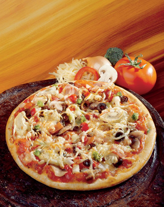 2. Roşiile şi ciupercile se curăţă şi se taie feliuţe. Bucăţelele mici de broccoli se fierb în apă cu sare 10 minute. Se unge aluatul cu ulei, se pun roşiile, ciuper­cile, jambonul tăiat fâşii, anghinarea, broccoli şi măslinile, iar deasupra se rade caşcavalul.