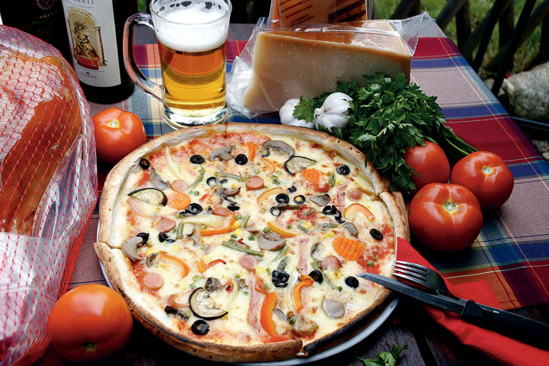 4. Alatul dospit se întinde într-o foaie groasă de 1 cm şi se pune într-o tavă unsă cu ulei şi tapetată cu făină. Se presară umplutura de şunculiţă şi cârnăciori, apoi se adaugă ardeii şi roşiile tăiate rondele, caşcavalul ras şi măslinele. Se coace în cuptorul încins, la foc potrivit, 25-35 minute.