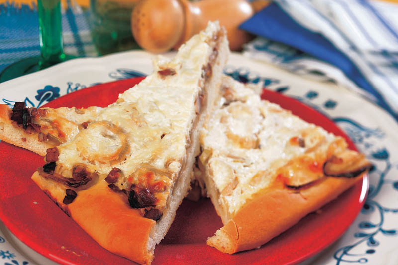 3. Aluatul crescut se întinde într-o foaie subţire şi se pune într-o tavă unsă cu unt şi tapetată cu făină. Se coace în cuptorul încins 15-20 minute, apoi se presară baconul şi ceapa, roşiile tăiate felii şi smântâna bătută cu brânza rasă şi verdeaţa tocată mărunt. Se pune din nou la cuptor şi se mai coace 30-40 minute.
