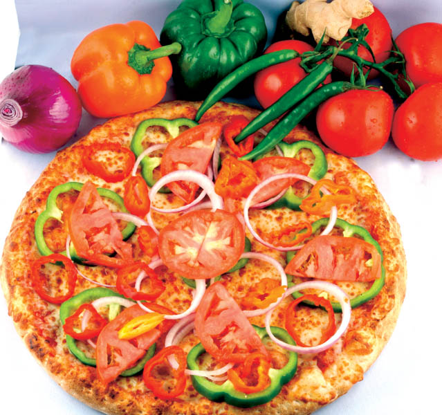3. Se întinde aluatul în tava unsă cu grăsime; se presară mozzarella şi caşcaval tăiate cubuleţe; se taie ceapa rondele subţiri împreună cu celelalte legume şi se presară peste brânză. Se bagă la cuptor circa 25-30 minute, se scoate şi se mai adaugă încă un rând de brânză şi caşcaval, după care se mai lasă 10 minute. Se serveşte cu legume proaspete deasupra.