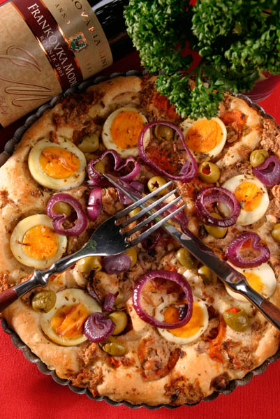 3. Aluatul crescut se întinde într-o foaie groasă de 4-5 mm şi se pune într-o tavă rotundă unsă cu ulei. Se presară apoi compoziţia de ciuperci, ouăle tăiate în jumătăţi, ceapa tăiată rondele, măslinele şi caşcavalul ras. Se coace în cuptorul foarte bine încins, 25-30 minute. După 15 minute focul se reduce la potrivit.