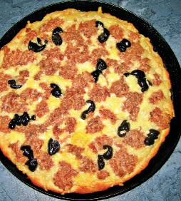 3. Aluatul obţinut se împarte în două şi se dă la frigider cam 30 minute. După cele 30 de minute, se întinde aluatul şi se pune în tava care a fost unsă cu ulei. Deasupra se presară caşcavalul ras şi se acoperă toată suprafaţa aluatului. Cu o furculiţă se pune tonul peste caşcaval şi apoi se adaugă măslinele. Se lasă la cuptor apoximativ 20 de minute.