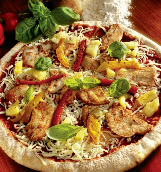 4. Se întinde coca cu sucitorul și se aranjează în tava de pizza. Se unge aluatul cu pasta picantă de ardei și se aranjează ingredientele. Se bagă la cuptor și, după ce s-a rumenit, se scoate şi se presară caşcavalul ras și frunzuliţele de cimbru proaspăt.