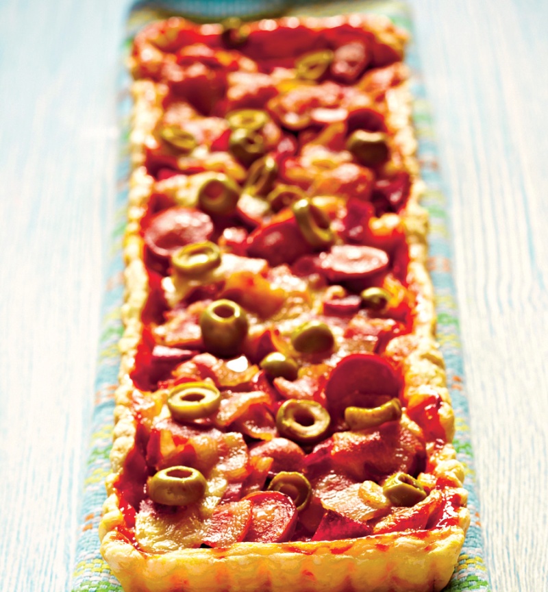 3. Se taie salamul felii subţiri care se curăţă de pieliţa protectoare şi se aşază peste pasta de tomate. Se pune şi baconul tăiat cubuleţe şi se adaugă măslinele.