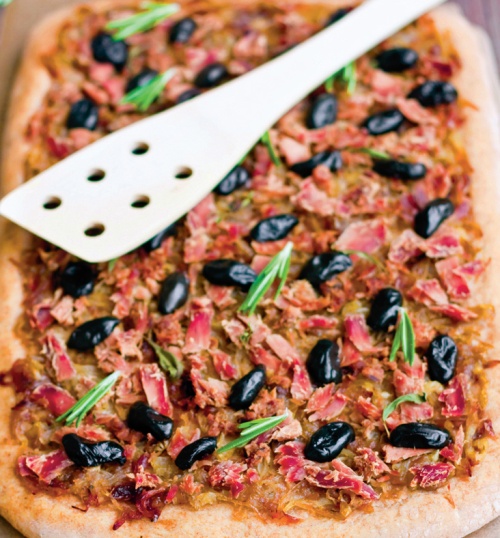 3. Aluatul se întinde şi apoi se transferă în tava de copt. Se acoperă cu tonul amestecat cu ceapă, se pun măsline şi se presară cu rozmarin uscat.