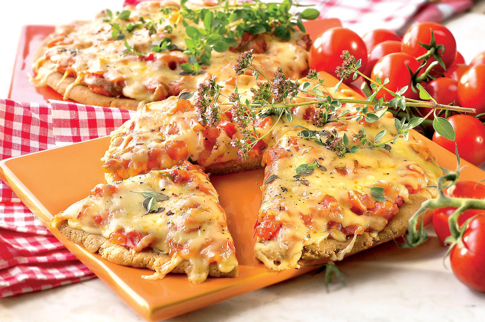 2. Aluatul se întinde într-o tavă în care se pune hârtie de copt. Se unge cu oul bătut şi se pun dea­supra ceapa tăiată rondele, şunca tăiată fâşii, roşiile decojite tăiate felii, sare, piper şi oregano.