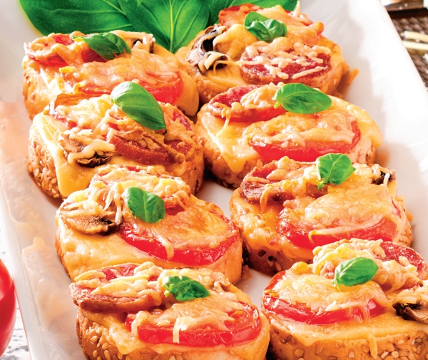 2. Brânza topita se taie în patru si apoi fiecare buca_ica se asaza deasupra unei felii de pâine. Urmeaza câte o felie de rosie, 2-3 felioare de ciuperci bine scurse, una-doua felioare de salam.