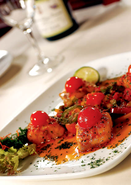 3. Se presară boabele de piper, usturoiul tocat mărunt, gogoşarul şi roşiile tăiate felii. La sfârşit se pun foile de dafin şi bucăţile de peşte, care se cufundă în sosul din vas. Se potriveşte sosul la gust cu sare şi zeamă de lămâie şi se coace în cuptorul încins, la foc mijlociu, 25-30 minute.