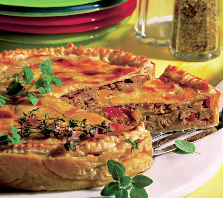 4. Se scoate aluatul de la rece, se împarte în două şi se întinde. Prima foaie se aşază în tavă, se toarnă umplutura şi se acoperă cu cealaltă foaie. Se strânge bine aluatul pe margini iar dacă a mai rămas cocă, se formează o coroniţă împletită. Se unge cu oul bătut şi se coace. Se serveşte ornată cu frunzuliţe de cimbru şi busuioc proaspăt.