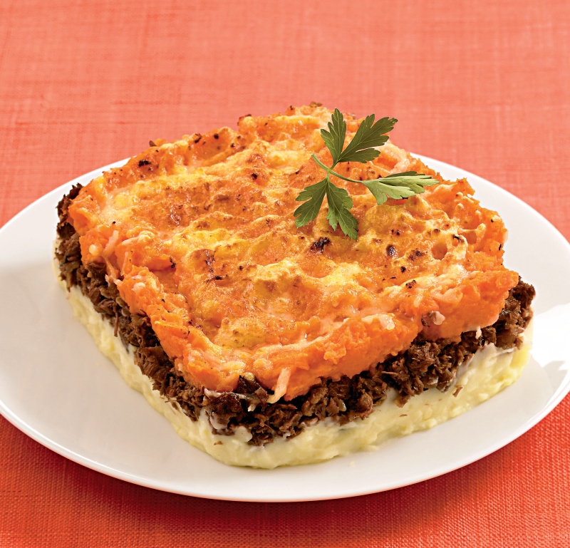 3. În tava de copt, se aşază un prim strat de piure de cartofi, apoi carnea şi piureul de morcovi drept «capac». Se dă la cuptor pentru 40 de minute şi apoi se lasă 10 minute să se aşeze. Se aduce la masă cu murături alături, eventual.