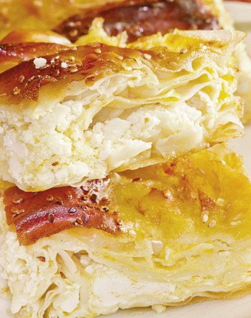 3. În tava unsă cu puţin ulei se aşază stratul de bază din cele 4-5 foi unse fiecare cu foarte puţin ulei, apoi se toarnă jumătate din cantitatea de brânză, se pun alte 4-5 foi, unse cu ulei, restul de brânză şi a treia parte de foi, unse cu ulei fiecare.