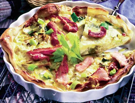 4. Ceapa se înăbuşă câteva minute în puţin ulei, cât să se înmoaie, şi apoi se amestecă în crema de brânză. Se scoate aluatul, se întinde cât este forma şi se adaugă compoziţia de brânză. Pe deasupra, se presară felii de bacon. Se bagă în cuptorul cald şi se lasă aproximativ 40 de minute. După ce s-a copt, se scoate, se feliază şi se serveşte.