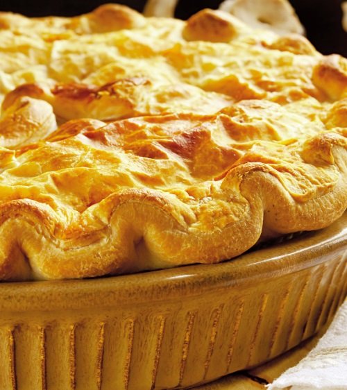 2. În vasul de copt, se pune amestecul de ciuperci şi apoi se acoperă cu o bucată de aluat pe mărimea vasului. După inspiraţie, acesta se poate lăsa întreg şi se poate modela strângându-l puţin, asemeni unor valuri.