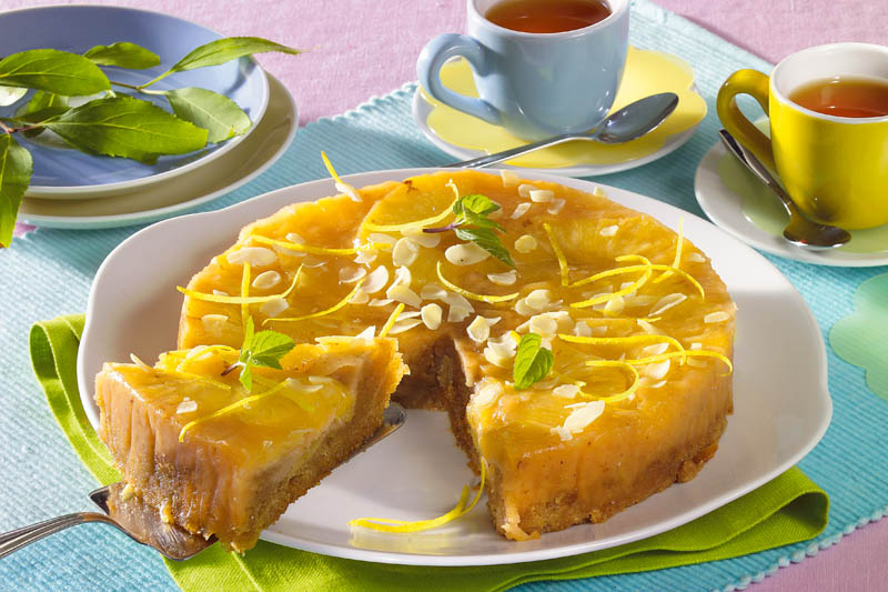 4. Când se răceşte, se răstoarnă pe un platou, se ornează cu migdale şi coajă de lămâie şi se poate servi.