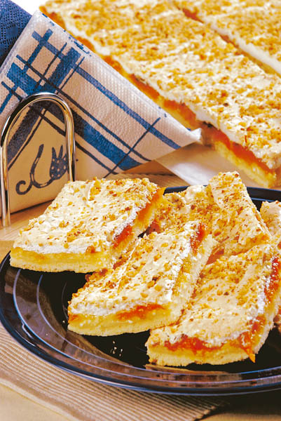 2. Între timp, se prepară aluatul. Se bat 3 gălbenuşuri cu un ou întreg şi 250 g zahăr, apoi se adaugă coaja de lămâie, uleiul, în porţii mici, iaurtul şi făina amestecată cu praful de copt. Se toarnă în tava tapetată cu hârtie de copt şi se coace la foc potrivit, 40-50 minute.