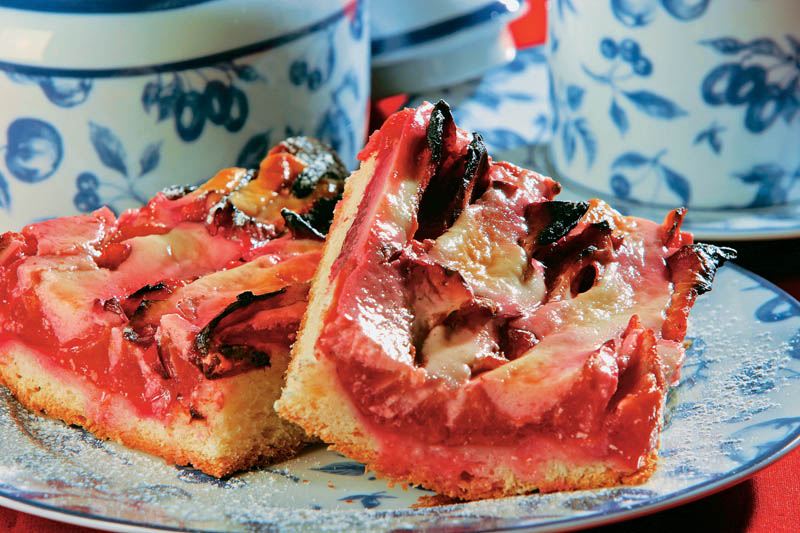 2. Se pune aluatul într-o tavă tapetată cu hârtie de copt, iar deasupra se presară prunele tăiate în jumătăţi. Se coace în cuptorul bine încins, la foc potrivit.
