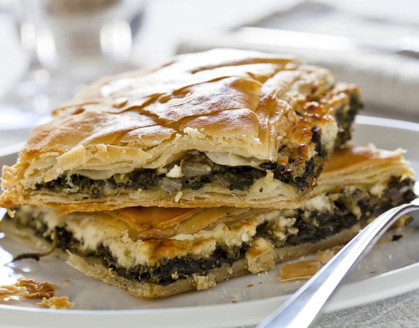 2. Aluatul se întinde și se împarte în două foi. Prima se aranjează în tavă, se toarnă compoziția de spanac și caşcavalul tăiat cubulețe. Se acoperă cu a doua foaie. Aluatul se înțeapă cu o scobitoare și se unge cu ou. Se dă la cuptor.