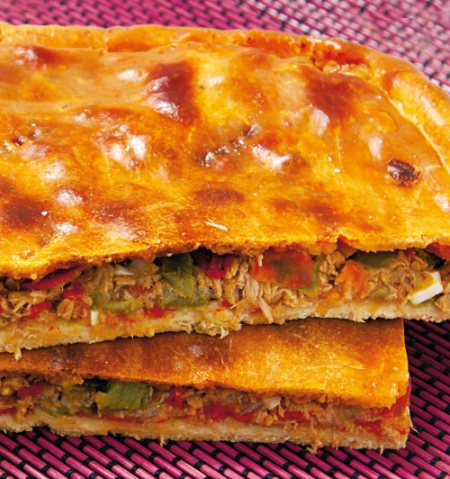 2. Pentru umplutură, se încinge uleiul şi se călesc timp de 5 minute ceapa tocată mărunt şi usturoiul tăiat feliuțe. Se trage de pe foc şi se lasă deoparte. Tonul scurs se mărunţeşte cu furculiţa, se adaugă brânza sfărâmată, ceapa şi usturoiul, măslinele tăiate mărunt, caperele, sare și piper.