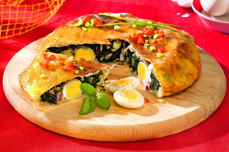 3. Se încălzeşte cuptorul. Se întinde aluatul fraged, împreună cu hârtia de copt, într-o tavă. Se toarnă compoziţia peste aluatul din formă şi se pun apoi ouăle fierte tari. Se întinde pe deasupra aluatul de foietaj, se umezesc marginile ambelor aluaturi şi se lipesc apăsănd uşor cu degetele. Se decupează un orificiu în mijlocul plăcintei, pentru eliminarea aburului, şi se întăreşte cu o bucată de folie de aluminiu, împăturită de câteva ori.