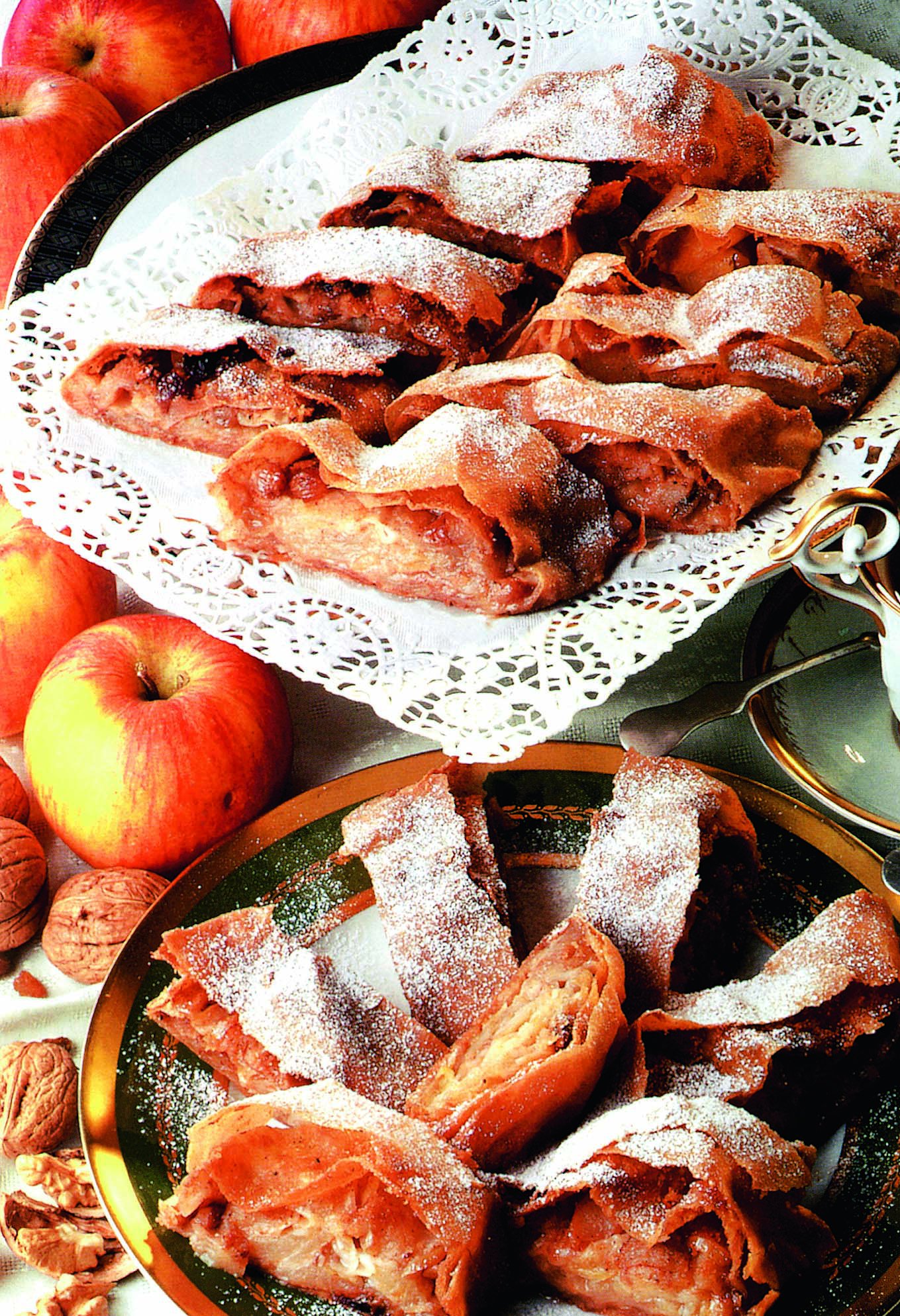 3. Se întinde aluatul într-o foaie cât mai subţire şi se unge cu unt. Se presară nucile amestecate cu zahărul tos şi coaja de lămâie, feliile de mere şi stafidele. Se rulează, se taie după dimensiunea tăvii, se aşază în tava unsă cu unt şi se coace în cuptorul încins, la foc iute, 30-35 minute. După 15 minute, focul se reduce la mijlociu.
