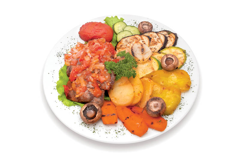 4. Pe un platou, se aşază carnea şi legumele asortate. Cartofii şi morcovii într-o parte, ciupercile înăbuşite şi mixul de legume tocate, în altă parte, iar restul, după preferinţă. Se ornează cu pătrunjel verde sau bucheţele de broccolli.