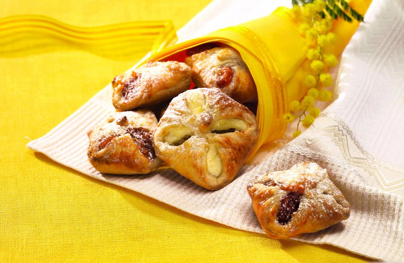 4. Se întinde aluatul pe planşetă cu sucitorul şi se taie pătrăţele. O parte se umplu cu nuci iar cealalte cu brânză de vaci. Se strâng în formă de pacheţele şi se ung cu ou bătut, apoi se bagă în cuptorul bine încins. Se servesc pudrate cu zahăr.