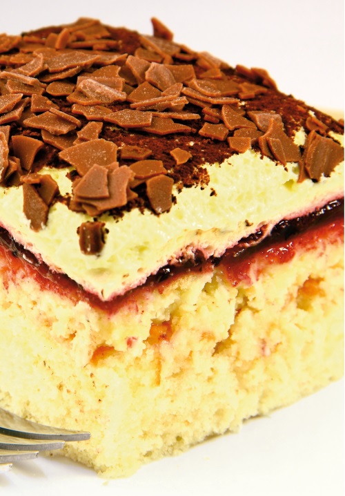 4.    Blatul se aşază într-un vas plat. Se pune gemul şi apoi crema care, dacă are cocoloaşe, se trece prin strecurătoarea fină. Se presară un strat fin de cacaco, apoi se pun fulgi de ciocolată şi se dă la rece pentru 6 ore.