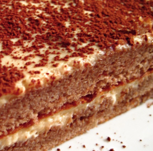 3. Blatul se lasă la răcit, se taie în două şi se însiropează cu amestecul de cafea şi vişinată. Peste primul blat se pune jumătate din cremă, se adaugă deasupra al doilea blat, iar peste acesta, din nou, crema. La final, se presară cacaua sau ciocolata rasă şi se dă la rece.