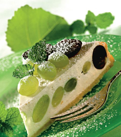 4. Se pune jumătate din cantitatea de cremă peste blat şi se nivelează. 2/3 din boabele de struguri se pun peste cremă. Deasupra se pune restul compoziţiei. Se lasă 3 ore la rece. La servit se pune deasupra restul boabelor de struguri. Se presară zahăr.