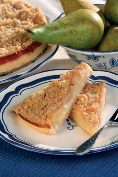 3. Se întinde aluatul de bază într-o foaie subţire şi se pune într-o tavă tapetată cu hârtie de copt. Se toarnă apoi compoziţia de brânză, se pun perele şi se coace în cuptorul încins, la foc potrivit, aproximativ 45 de minute. Se scoate apoi din cuptor se presară aluatul nisipos şi se mai coace 5-7 minute.