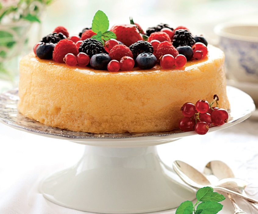 4. Se lasă să se răcească în tavă, se scoate prin răsturnare şi se aduce la masă cu fructe proaspete deasupra.