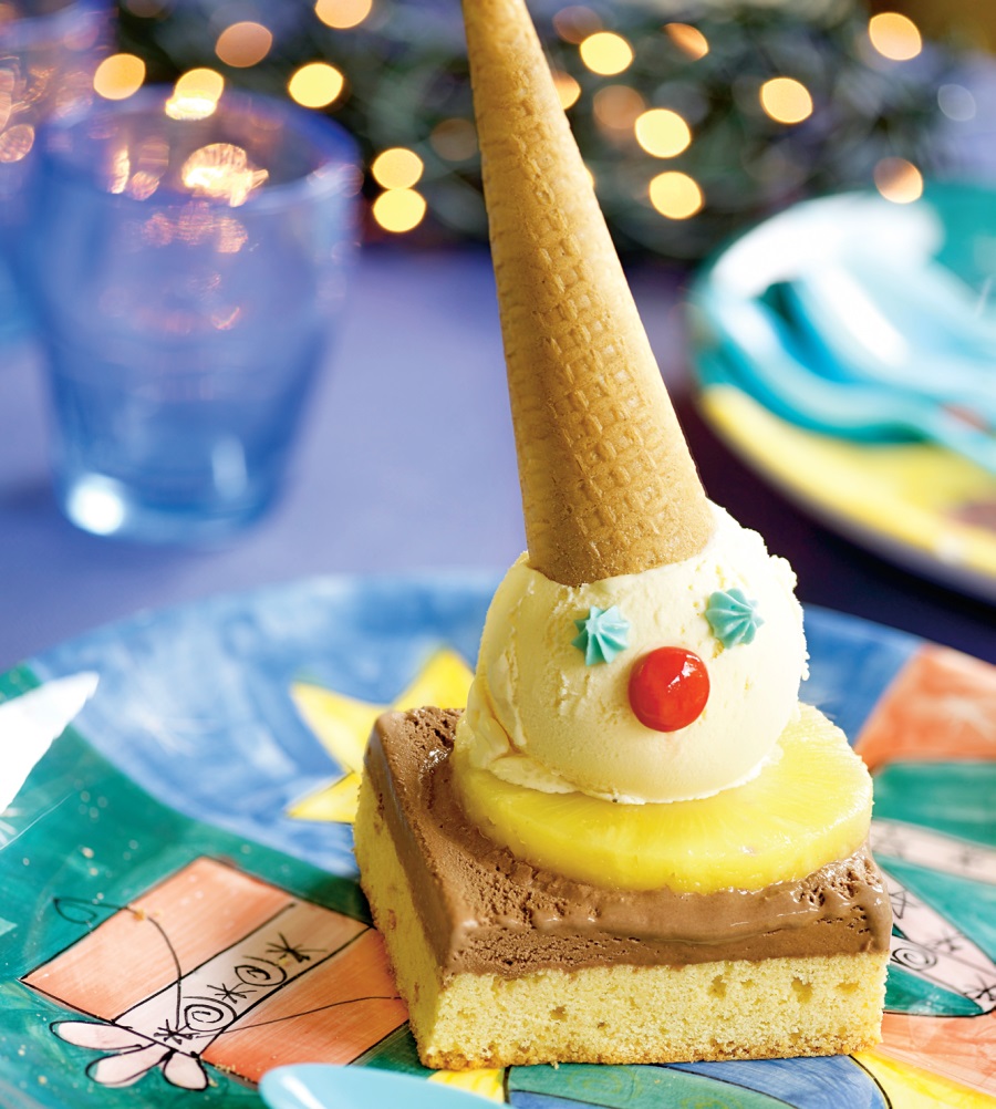 4.   Pentru servit, se aşază peste blat spuma de la frigider şi, în funcţie de gust, se poate adăuga îngheţată şi o rondea de ananas. Se decorează cu bombonele.