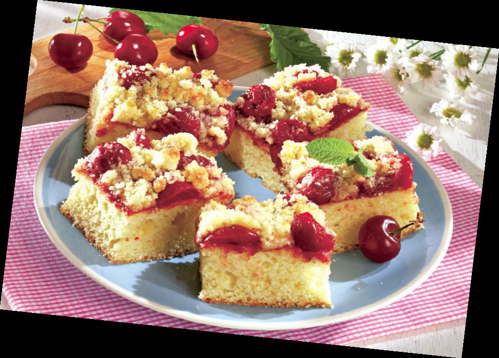 4. Se bagă compoziţiile la cuptor şi, după ce s-au copt, se scot şi se lasă să se răcească. Compoziţia fără cireşe se scoate din tavă şi se fărâmiţează peste cealaltă compoziţie. Se lasă să se răcească şi se serveşte pudrată cu zahăr şi coajă de lămâie verde.