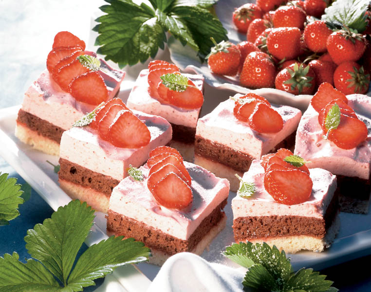 4. Primul blat se aşază pe un platou şi se unge cu gem. Se acoperă cu blatul de ciocolată şi după aceea se pune în strat uniform crema de căpşuni. Se lasă o oră la frigider, se taie bucăţi şi se ornează cu felii subţiri de căpşuni, zahăr pudră şi frunzuliţe de mentă.