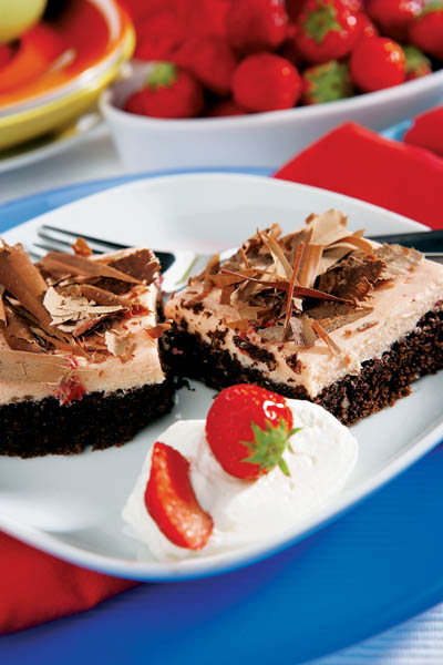 3. Blatul copt şi răcit se acoperă cu această cremă şi se ornează cu ciocolată rasă. Se taie bucăţi pătrate şi se serveşte cu restul de fructe şi frişcă.