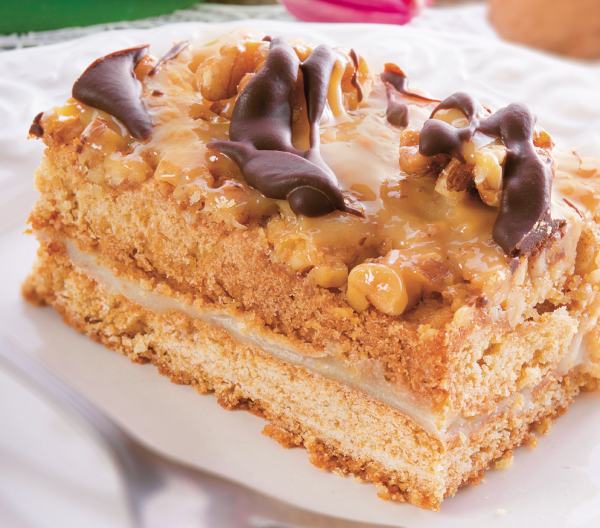 4.  Într-o tavă, se aşază o foaie, se unge cu crema de lămâie şi se acoperă cu a doua foaie peste care se presară nucile uşor mărunţite. Se prepară caramelul pentru care zahărul pudră se pune la topit şi, când a devenit auriu spre maro, se toarnă frişca lichidă. Se amestecă un minut şi se toarnă peste prăjitură. Se lasă aşa într-un loc răcoros de pe o zi pe alta.