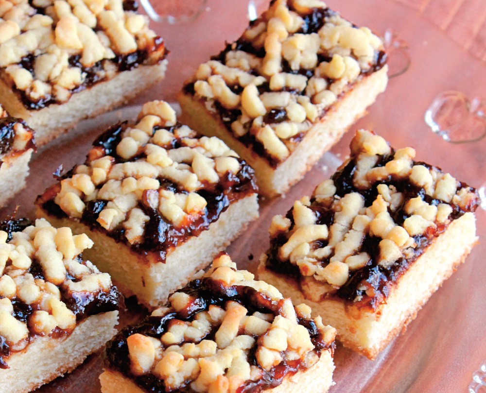 4.    Toate ingredientele pentru firimituri se amestecă şi se presară deasupra gemului.  Se dă tava la cuptor pentru 20-25 de minute. După coacere, se lasă să se răcească şi apoi se taie.